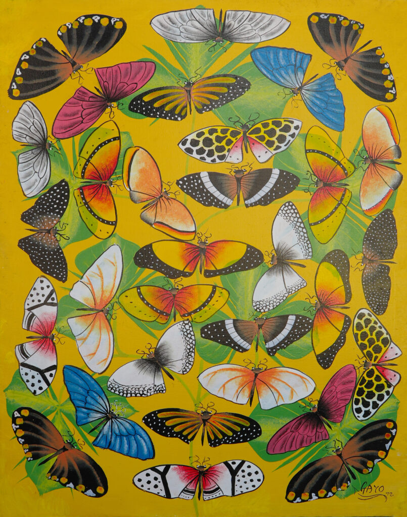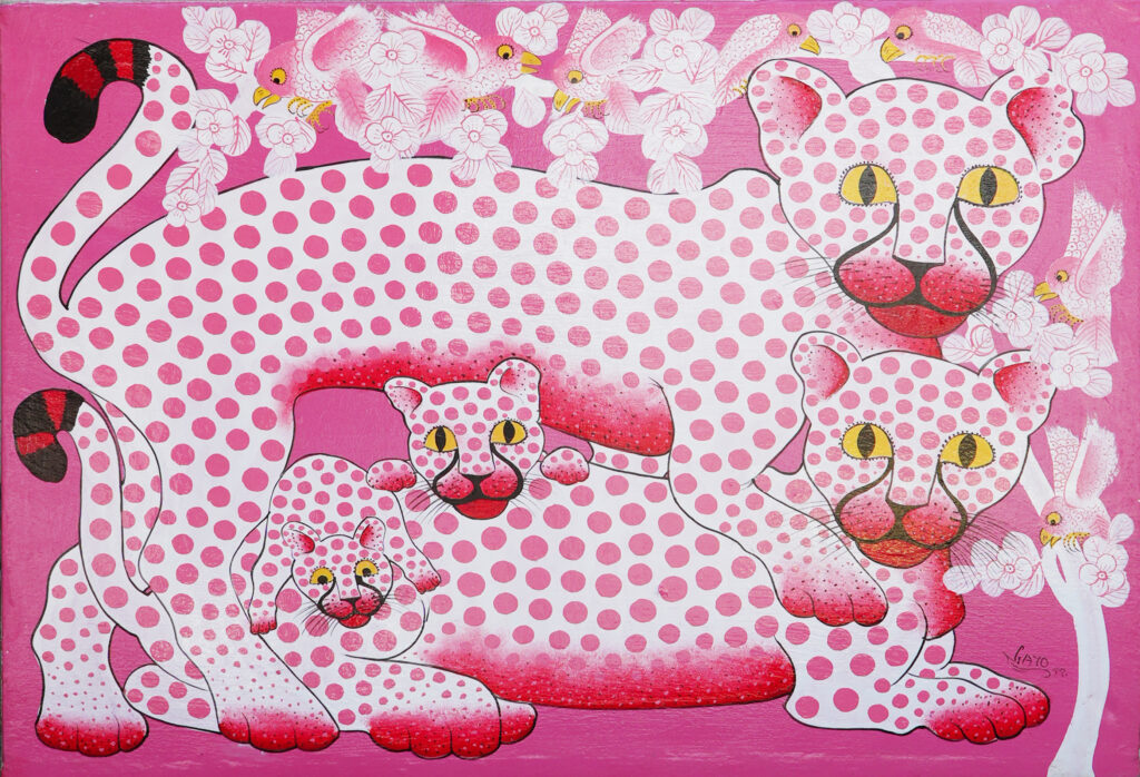 ガーヨーの作品で特に多く描かれるモチーフは、チーター(スワヒリ語で「Duma」)と蝶(「Kipepeo」)です。彼にとってチーターは単なる野生動物ではなく、父・母・子どもからなる家族の象徴として描かれます。作品の中では、親子で寄り添うチーターや、群れで生きる姿が表現され、そこには家族の絆や守り合う関係性への思いが込められています。一方で蝶は、鮮やかな色彩と軽やかな姿から「幸福」や「希望」を象徴する存在として登場します。画面を舞う蝶は、生命の喜びや未来への希望を表現する重要なモチーフとなっています。