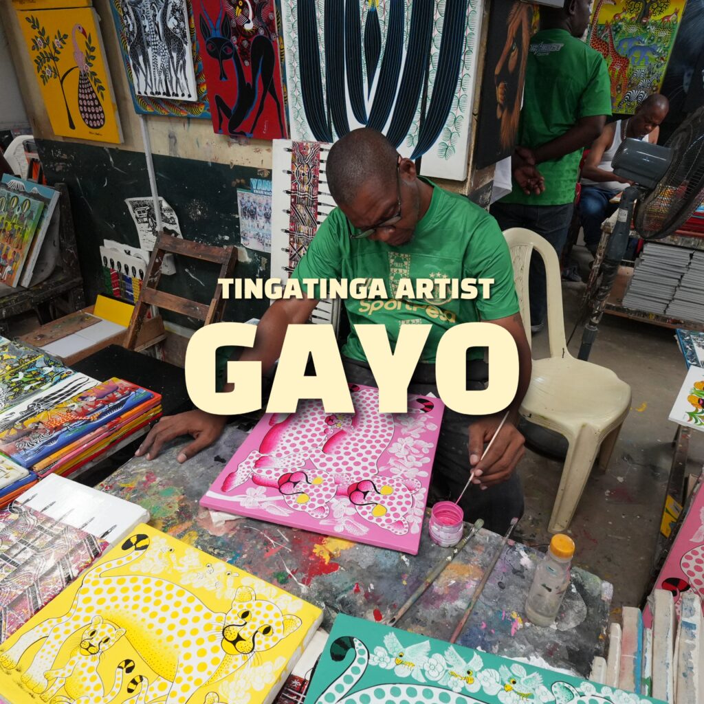 その後、技術を磨き続けたガーヨーは1997年、正式にティンガティンガ・アーティストとして活動を開始します。伝統的なティンガティンガの技法を受け継ぎながらも、自身の感性や思想を強く反映した作品を生み出し、現在ではタンザニア国内外で評価される作家となっています。